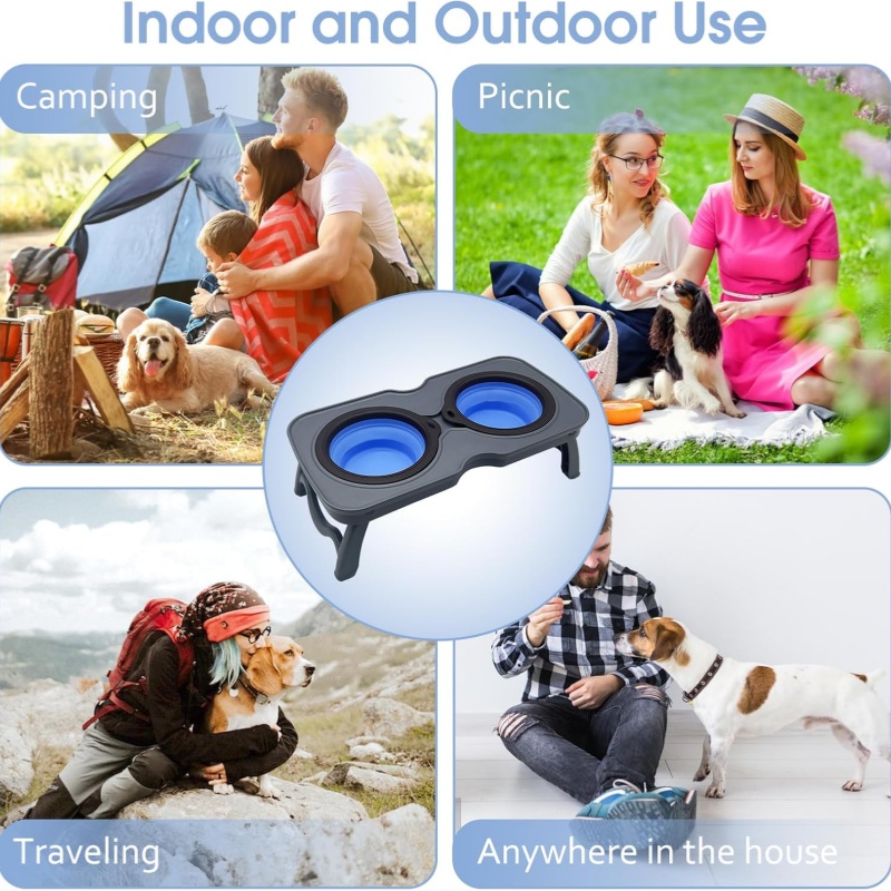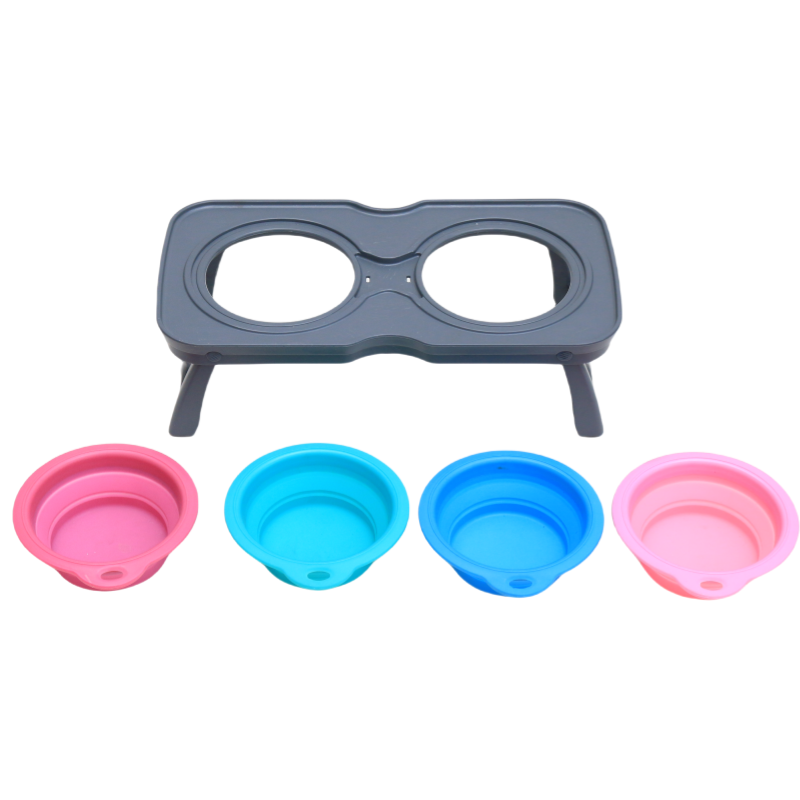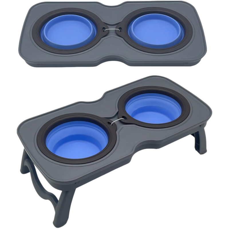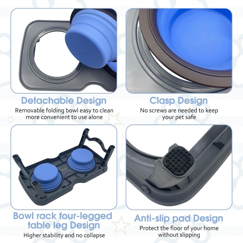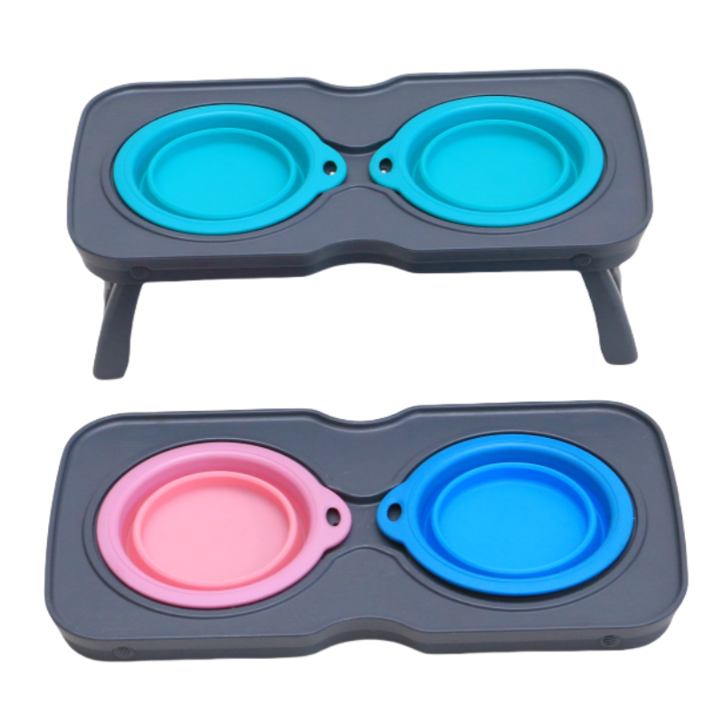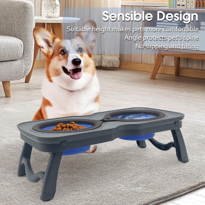 Travel Raised Stand Collapsible Silicone Double Diner Bowls Non-Slip Food and Water Bowls Holder for Small Dogs and Cats